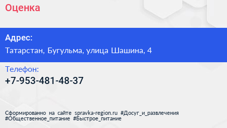 Оценка+ по адресу Татарстан, Бугульма, улица Шашина, 4 в дальнейшем Организация, размещена в следующих категориях: