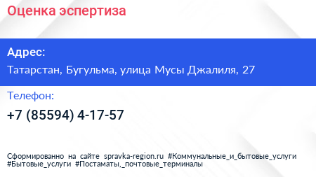 Оценка эспертиза по адресу Татарстан, Бугульма, улица Мусы Джалиля, 27 в дальнейшем Организация, размещена в следующих категориях: