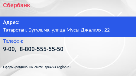 Сбербанк по адресу Татарстан, Бугульма, улица Мусы Джалиля, 22 в дальнейшем Организация, размещена в следующих категориях: