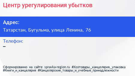 Центр урегулирования убытков по адресу Татарстан, Бугульма, улица Ленина, 76 в дальнейшем Организация, размещена в следующих категориях: