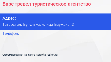 Барс тревел, туристическое агентство по адресу Татарстан, Бугульма, улица Баумана, 2 в дальнейшем Организация, размещена в следующих категориях: