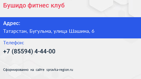 Бушидо, фитнес-клуб по адресу Татарстан, Бугульма, улица Шашина, 6 в дальнейшем Организация, размещена в следующих категориях: