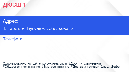 ДЮСШ №1 по адресу Татарстан, Бугульма, Залакова, 7 в дальнейшем Организация, размещена в следующих категориях: