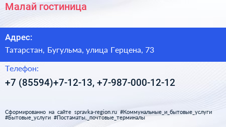 Малай, гостиница по адресу Татарстан, Бугульма, улица Герцена, 73 в дальнейшем Организация, размещена в следующих категориях: