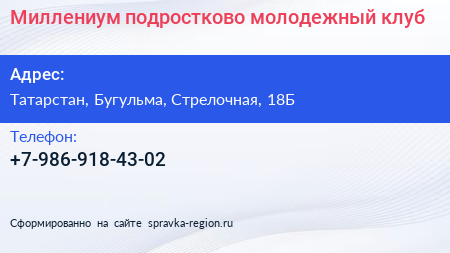 Миллениум, подростково-молодежный клуб по адресу Татарстан, Бугульма, Стрелочная, 18Б в дальнейшем Организация, размещена в следующих категориях: