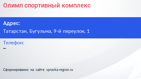 Олимп, спортивный комплекс по адресу Татарстан, Бугульма, 9-й переулок, 1 в дальнейшем Организация, размещена в следующих категориях: