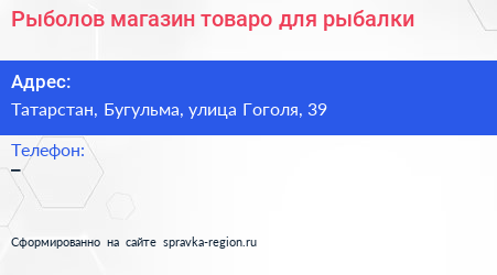 Рыболов, магазин товаро для рыбалки по адресу Татарстан, Бугульма, улица Гоголя, 39 в дальнейшем Организация, размещена в следующих категориях: