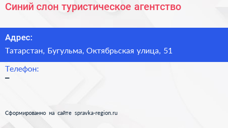 Синий слон, туристическое агентство по адресу Татарстан, Бугульма, Октябрьская улица, 51 в дальнейшем Организация, размещена в следующих категориях: