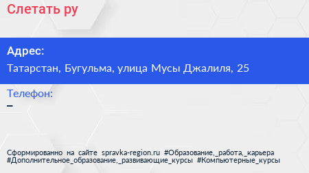 Слетать.ру по адресу Татарстан, Бугульма, улица Мусы Джалиля, 25 в дальнейшем Организация, размещена в следующих категориях: