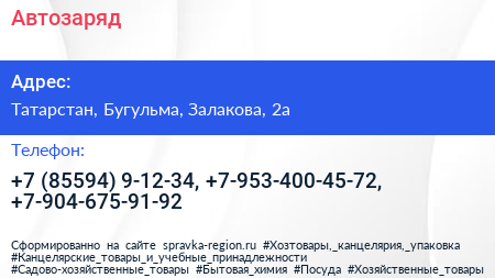 Автозаряд по адресу Татарстан, Бугульма, Залакова, 2а в дальнейшем Организация, размещена в следующих категориях: