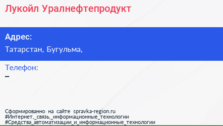 Лукойл-Уралнефтепродукт по адресу Татарстан, Бугульма, в дальнейшем Организация, размещена в следующих категориях: