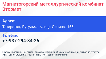 Магнитогорский металлургический комбинат Втормет по адресу Татарстан, Бугульма, улица Ленина, 155 в дальнейшем Организация, размещена в следующих категориях: