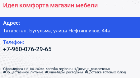 Идея комфорта, магазин мебели по адресу Татарстан, Бугульма, улица Нефтянников, 44а в дальнейшем Организация, размещена в следующих категориях: