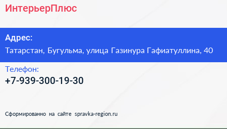 ИнтерьерПлюс по адресу Татарстан, Бугульма, улица Газинура Гафиатуллина, 40 в дальнейшем Организация, размещена в следующих категориях: