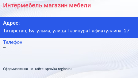 Интермебель, магазин мебели по адресу Татарстан, Бугульма, улица Газинура Гафиатуллина, 27 в дальнейшем Организация, размещена в следующих категориях: