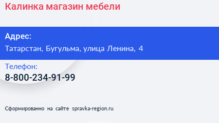 Калинка, магазин мебели по адресу Татарстан, Бугульма, улица Ленина, 4 в дальнейшем Организация, размещена в следующих категориях: