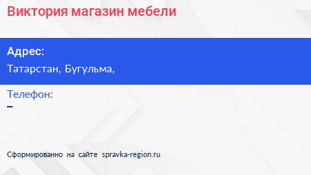 Виктория, магазин мебели по адресу Татарстан, Бугульма, в дальнейшем Организация, размещена в следующих категориях: