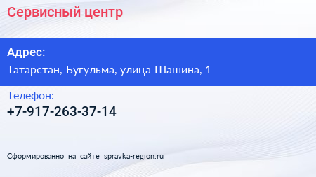 Сервисный центр по адресу Татарстан, Бугульма, улица Шашина, 1 в дальнейшем Организация, размещена в следующих категориях: