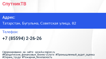 СпутникТВ по адресу Татарстан, Бугульма, Советская улица, 82 в дальнейшем Организация, размещена в следующих категориях: