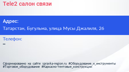 Tele2, салон связи по адресу Татарстан, Бугульма, улица Мусы Джалиля, 26 в дальнейшем Организация, размещена в следующих категориях: