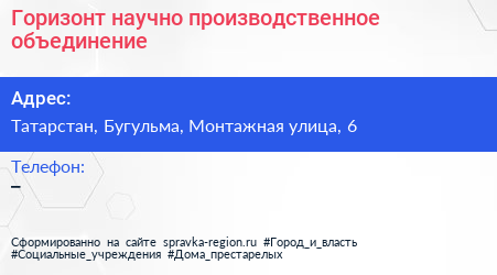Горизонт, научно-производственное объединение по адресу Татарстан, Бугульма, Монтажная улица, 6 в дальнейшем Организация, размещена в следующих категориях: