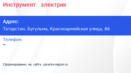 Инструмент + электрик по адресу Татарстан, Бугульма, Красноармейская улица, 86 в дальнейшем Организация, размещена в следующих категориях: