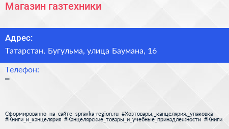 Магазин газтехники по адресу Татарстан, Бугульма, улица Баумана, 16 в дальнейшем Организация, размещена в следующих категориях: