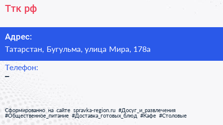 Ттк-рф по адресу Татарстан, Бугульма, улица Мира, 178а в дальнейшем Организация, размещена в следующих категориях: