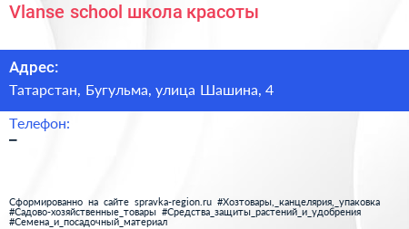 Vlanse school, школа красоты по адресу Татарстан, Бугульма, улица Шашина, 4 в дальнейшем Организация, размещена в следующих категориях: