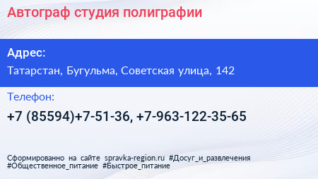 Автограф, студия полиграфии по адресу Татарстан, Бугульма, Советская улица, 142 в дальнейшем Организация, размещена в следующих категориях: