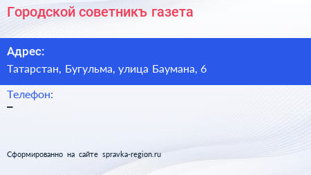 Городской советникъ, газета по адресу Татарстан, Бугульма, улица Баумана, 6 в дальнейшем Организация, размещена в следующих категориях: