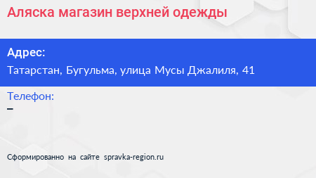 Аляска, магазин верхней одежды по адресу Татарстан, Бугульма, улица Мусы Джалиля, 41 в дальнейшем Организация, размещена в следующих категориях: