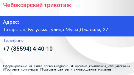 Чебоксарский трикотаж по адресу Татарстан, Бугульма, улица Мусы Джалиля, 27 в дальнейшем Организация, размещена в следующих категориях: