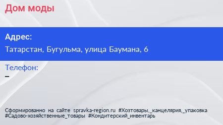Дом моды по адресу Татарстан, Бугульма, улица Баумана, 6 в дальнейшем Организация, размещена в следующих категориях:
