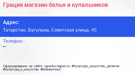 Грация, магазин белья и купальников по адресу Татарстан, Бугульма, Советская улица, 45 в дальнейшем Организация, размещена в следующих категориях: