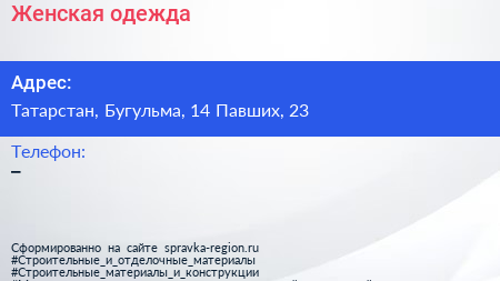 Женская одежда по адресу Татарстан, Бугульма, 14 Павших, 23 в дальнейшем Организация, размещена в следующих категориях: