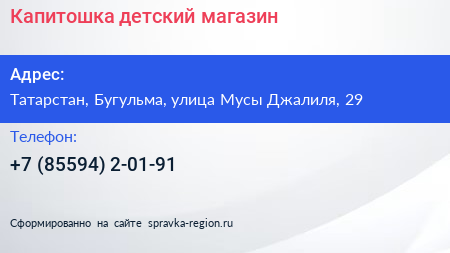 Капитошка, детский магазин по адресу Татарстан, Бугульма, улица Мусы Джалиля, 29 в дальнейшем Организация, размещена в следующих категориях:
