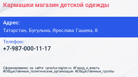 Кармашки, магазин детской одежды по адресу Татарстан, Бугульма, Ярослава Гашека, 8 в дальнейшем Организация, размещена в следующих категориях:
