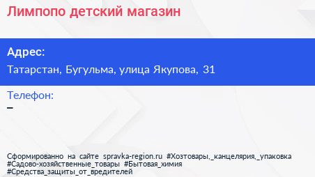 Лимпопо, детский магазин по адресу Татарстан, Бугульма, улица Якупова, 31 в дальнейшем Организация, размещена в следующих категориях:
