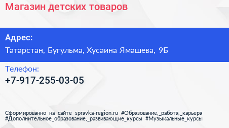 Магазин детских товаров по адресу Татарстан, Бугульма, Хусаина Ямашева, 9Б в дальнейшем Организация, размещена в следующих категориях: