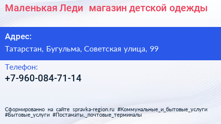 Маленькая Леди+, магазин детской одежды по адресу Татарстан, Бугульма, Советская улица, 99 в дальнейшем Организация, размещена в следующих категориях: