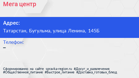 Мега центр по адресу Татарстан, Бугульма, улица Ленина, 145Б в дальнейшем Организация, размещена в следующих категориях: