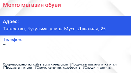 Monro, магазин обуви по адресу Татарстан, Бугульма, улица Мусы Джалиля, 25 в дальнейшем Организация, размещена в следующих категориях: