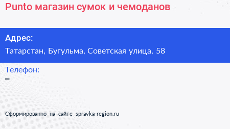 Punto, магазин сумок и чемоданов по адресу Татарстан, Бугульма, Советская улица, 58 в дальнейшем Организация, размещена в следующих категориях: