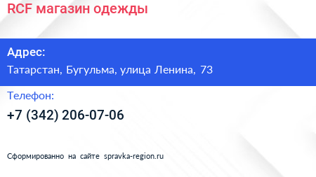 RCF, магазин одежды по адресу Татарстан, Бугульма, улица Ленина, 73 в дальнейшем Организация, размещена в следующих категориях: