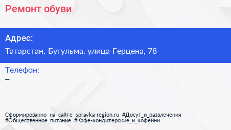Ремонт обуви по адресу Татарстан, Бугульма, улица Герцена, 78 в дальнейшем Организация, размещена в следующих категориях: