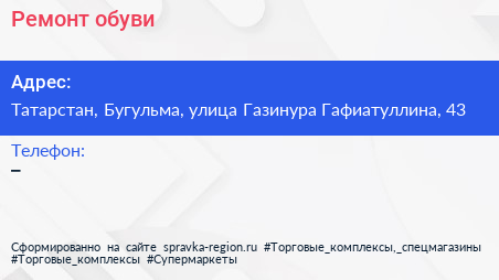 Ремонт обуви по адресу Татарстан, Бугульма, улица Газинура Гафиатуллина, 43 в дальнейшем Организация, размещена в следующих категориях: