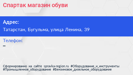 Спартак, магазин обуви по адресу Татарстан, Бугульма, улица Ленина, 39 в дальнейшем Организация, размещена в следующих категориях: