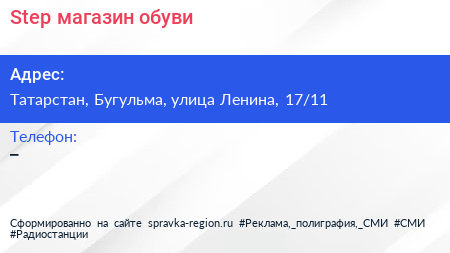 Step, магазин обуви по адресу Татарстан, Бугульма, улица Ленина, 17/11 в дальнейшем Организация, размещена в следующих категориях: