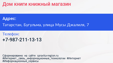 Дом книги, книжный магазин по адресу Татарстан, Бугульма, улица Мусы Джалиля, 7 в дальнейшем Организация, размещена в следующих категориях: